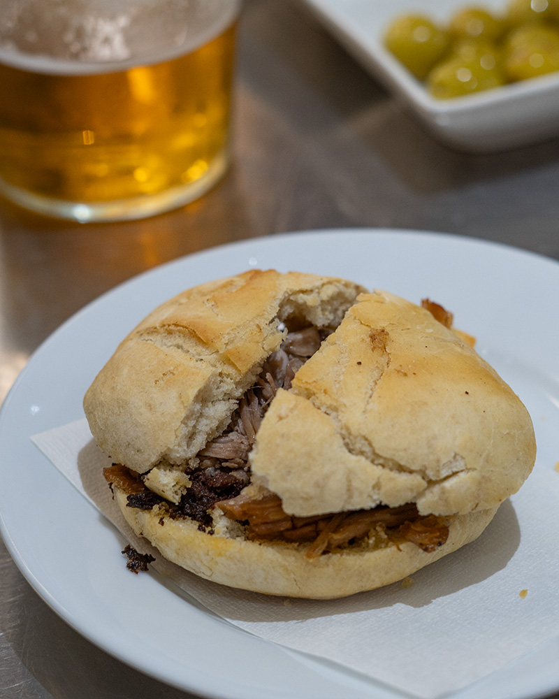Si tuviera que elegir una sola bodega en Sevilla, probablemente sería la Bodeguita Romero. Diría que es la que tiene una oferta más gastronómica, donde se lleva mejor la tradición a mayores niveles de excelencia sin traicionarla, que lo que hace tantas veces la alta cocina. Ahí estoy con mi caña, pero lo que toca es un vino del Marco de Jerez, un amontillado por ejemplo, el mejor maridaje para este magnífico montadito, con pan crujiente y sabroso y un relleno jugoso y abundante. ¡Qué manera de disfrutar!