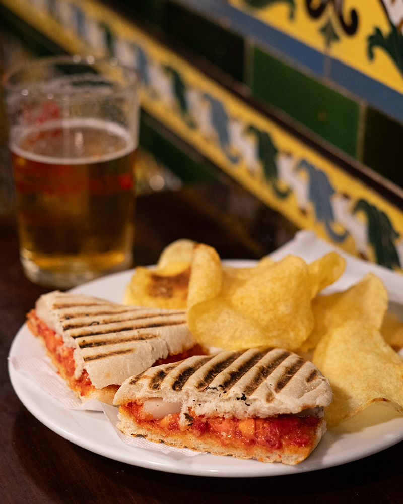 Tengo mucho comentario afirmando que el Casco Antiguo de Sevilla está perdido. Ha quedado en manos de los turistas. Es cierto que había centenares y llenaban los bares, pero no han conseguido desvirtuar del todo la oferta. Otras ciudades han quedado inundadas de brunch, pizza, sushi y hamburguesa. En Sevilla sigue habiendo montaditos de pringá, espinacas con garbanzos o solomillo al whisky, que ni suele ser solomillo ni tampoco lleva whisky. Vale la pena disfrutar de cosas como este montadito de chorizo picante y queso andaluz de la Taberna Manolo Cateca, ¡un triunfo!