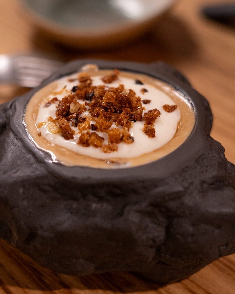 Cremoso de cebolla asada, huevo a baja temperatura y espuma de patata