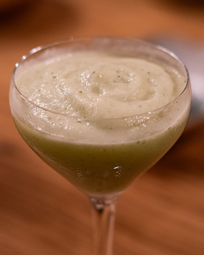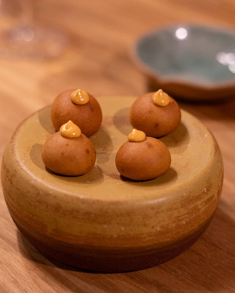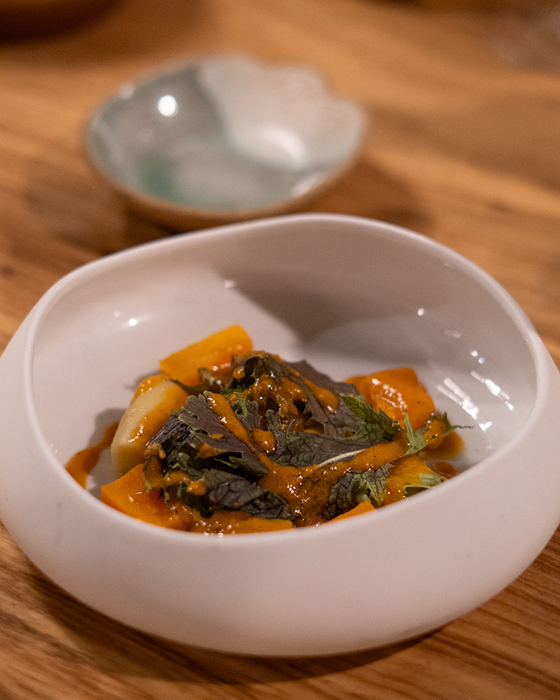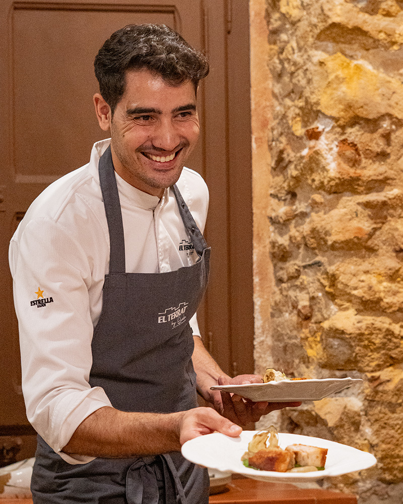 Empezamos con unos aperitivos: unos buñuelos líquidos de pimiento asado y un cóctel de vermut blanco con espuma de pepino y melón. De entrantes, una ensalada de otoño con calabaza, puerros asados, hoja de mostaza y vinagreta de romesco y un cremoso de cebolla asada, huevo a baja temperatura y espuma de patata. El plato principal, una panceta de cerdo Duroc a baja temperatura con acelgas en su jugo y cremoso de berenjena. A acabamos con texturas de calabaza, helado de jengibre y fruta de la pasión.