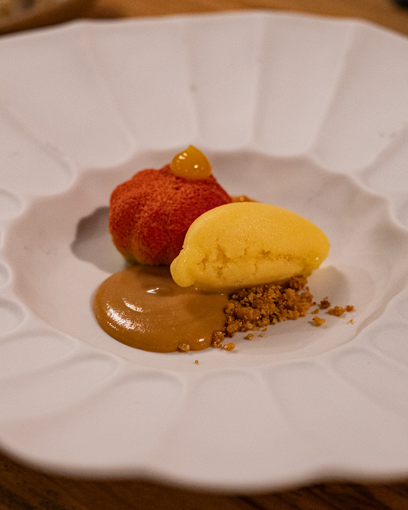 Texturas de calabaza, helado de jengibre y fruta de la pasión