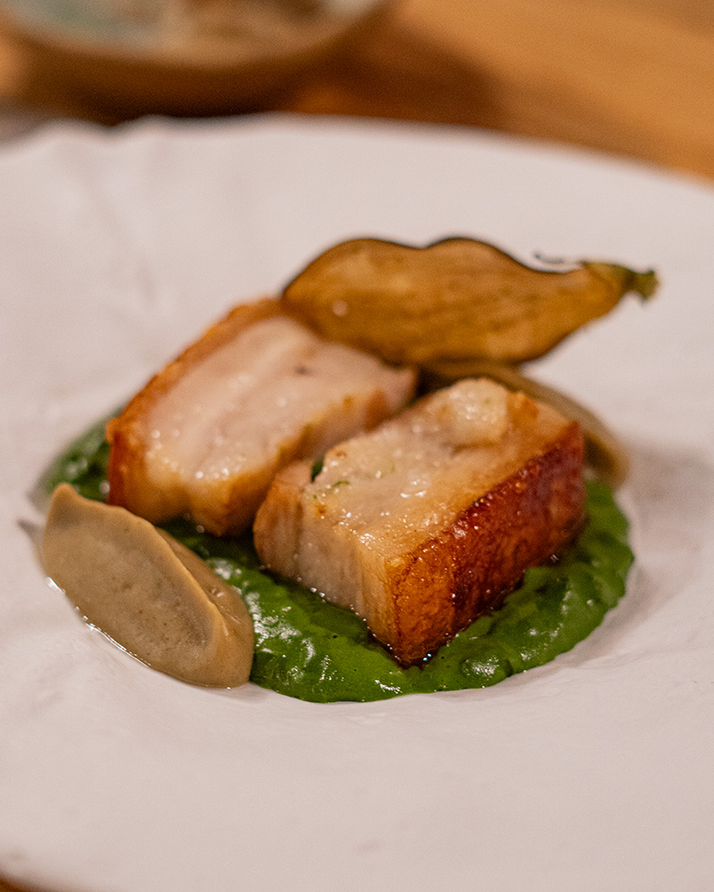 Panceta Duroc a baja temperatura con acelgas en su jugo y cremoso de berenjena