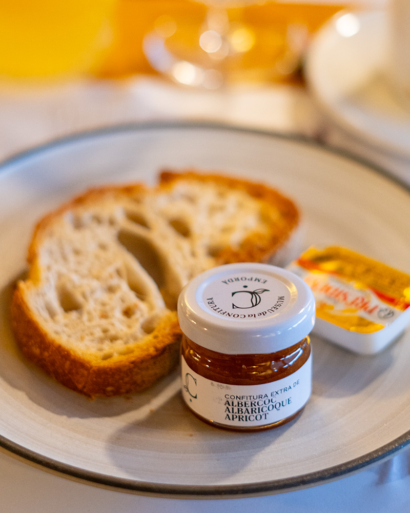 Mermelada y mantequilla con tostadas de pan del Hotel Empordà