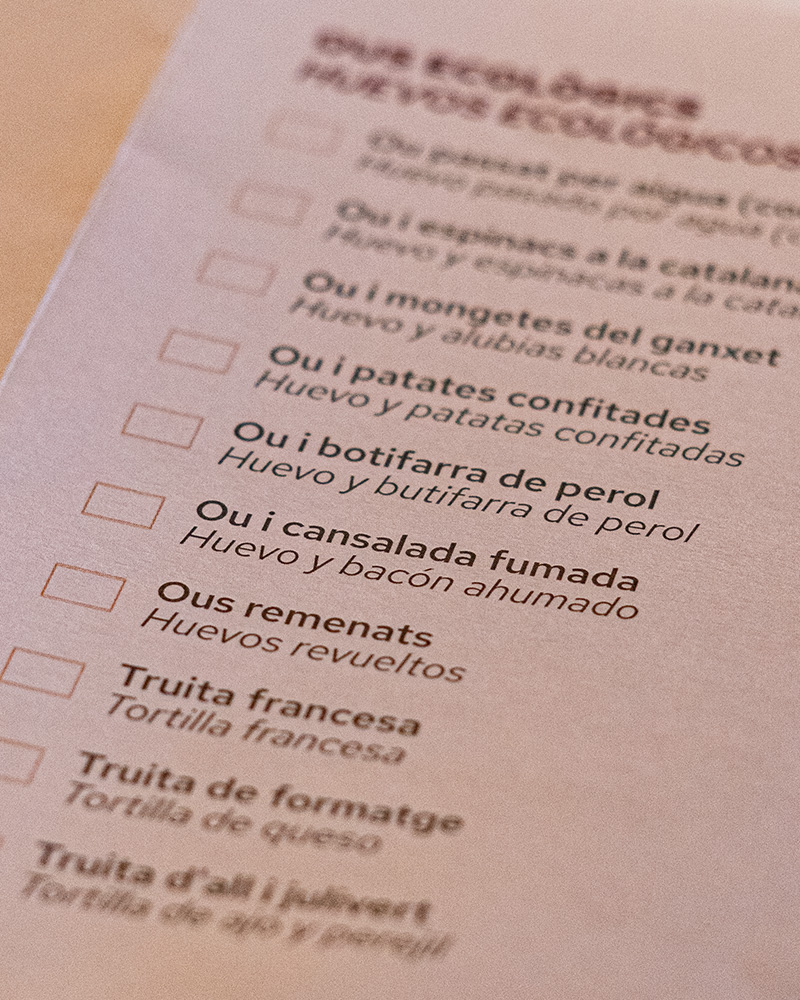 He tenido la suerte de vivir el lujo en hoteles de una arquitectura impresionante, con habitaciones más grandes que el piso en el que vivo y con un espacio para el desayuno solo para las habitaciones más exclusivas, pero desde una perspectiva gastronóimca siempre se quedan cortos. Lo primero es el horario, en el Hotel Empordà es de 7:30 a 12:00, eliges cuatro platos de una selección de una carta con más de 40, con algunos como el bol de yogur con granola artesana y fruta, los huevos fritos que puedes acompañar de botifarra del perol, panceta ahumada o espinacas a la catalana, el pan de tramuntana con tomate y anchoas en aceite o el sándwich mixto del Motel. Y a la mesa se acerca todo un Jaume Subirós, protagonista de la historia gastronómica del país, a ver si está todo a tu gusto. Esto sí es lujo. Os dejo aquí la impresionante carta: