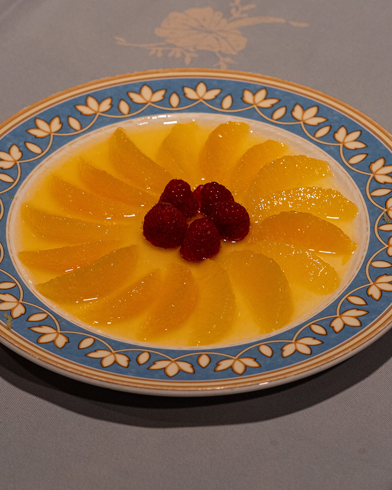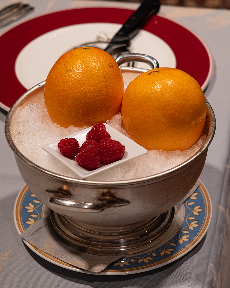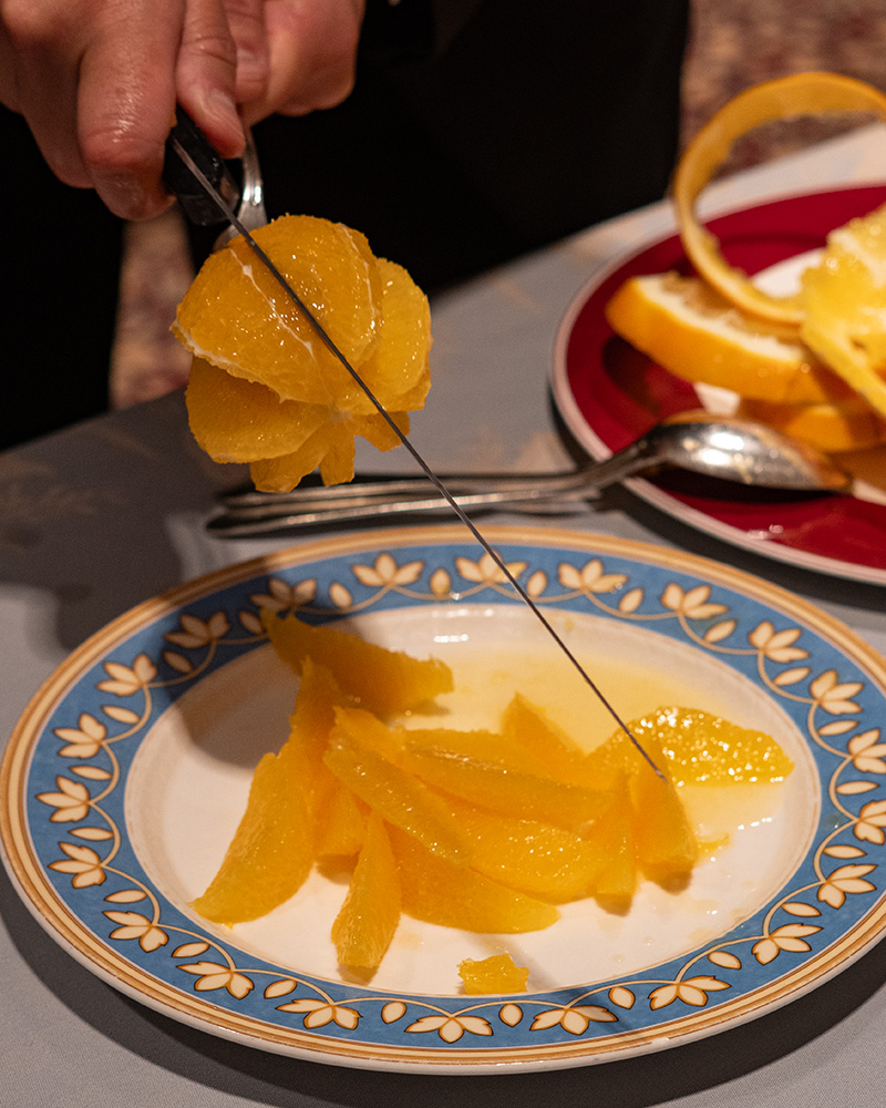 En el Restaurante Via Veneto preparan la naranja en sala desde hace décadas. La conocida como «Naranja al estilo Via Veneto». No tiene misterio, pero sí oficio. El maître la pela entera de una sola tira con pulso firme, después corta gajo a gajo, y muy importante, se aprovecha hasta la última gota de zumo. Algunos pensaréis que es una manera absurda de poder cobrar una simple naranja más cara y entonces es que no habréis entendido nada. Es un acto casi litúrgico que hace que una simple naranja sea toda una experiencia. Ahora, no es algo que vale todo el mundo, claro.
