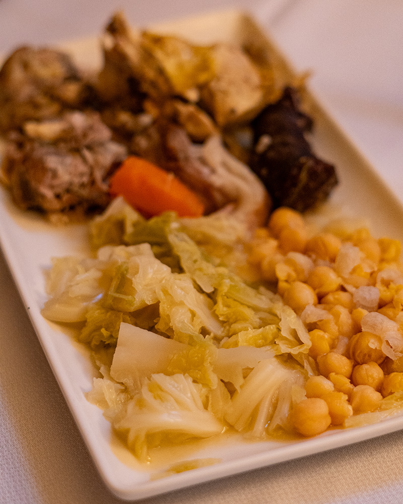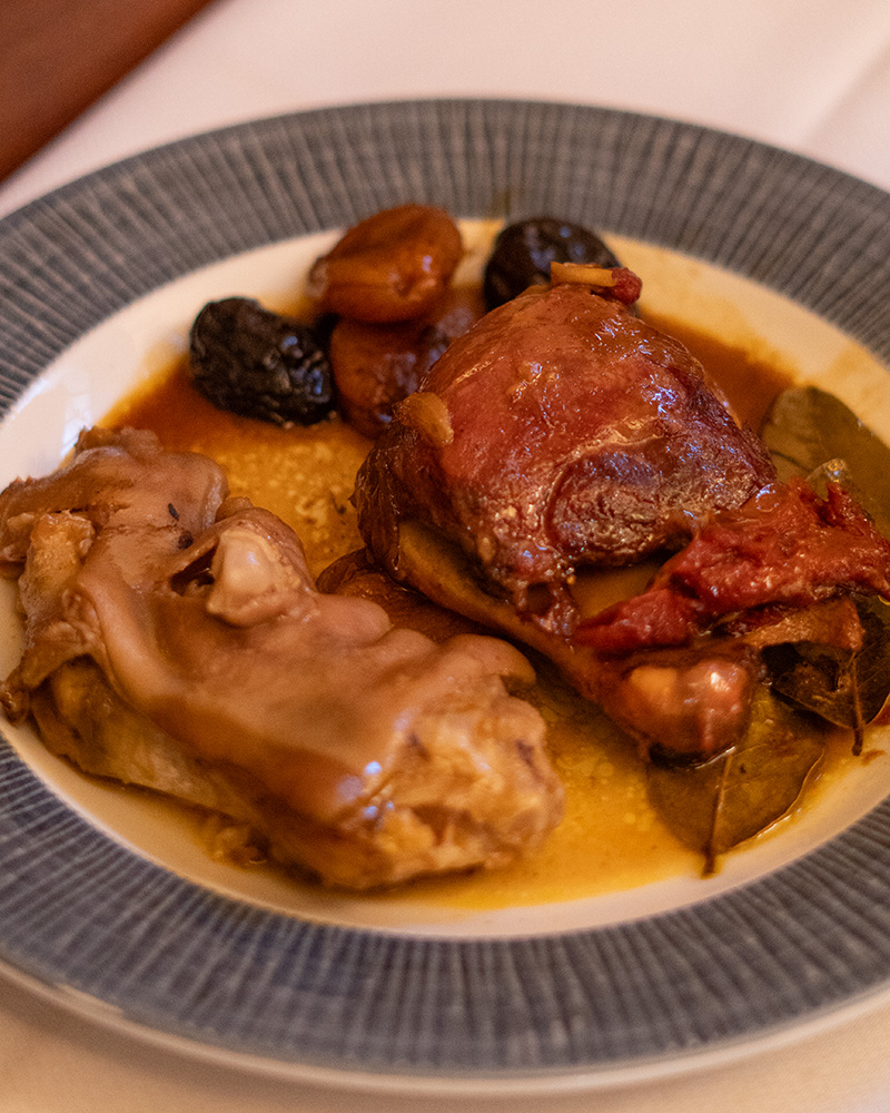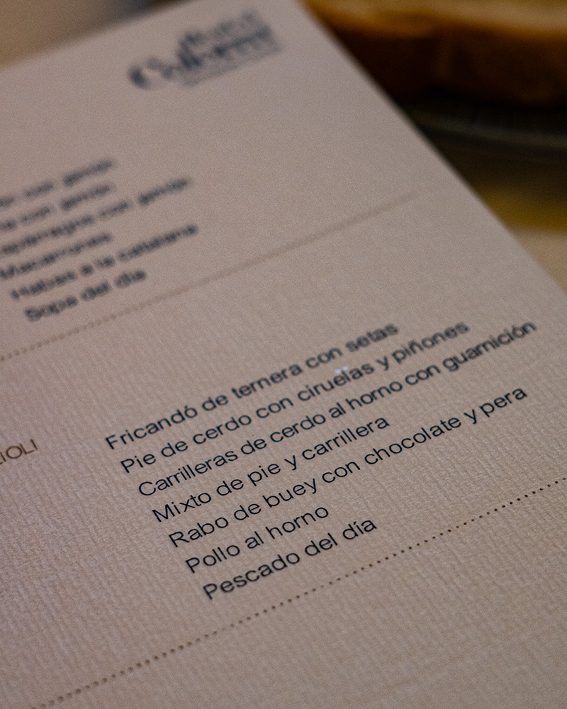 Entre muchas otras especialidades, se pueden pedir manitas con ciruelas y piñones y carrilleras de cerdo al horno con su guarnición, o mitad y mitad, que fue lo que escogí. Una maravilla, especialmente si te gustan los guisos de siempre.