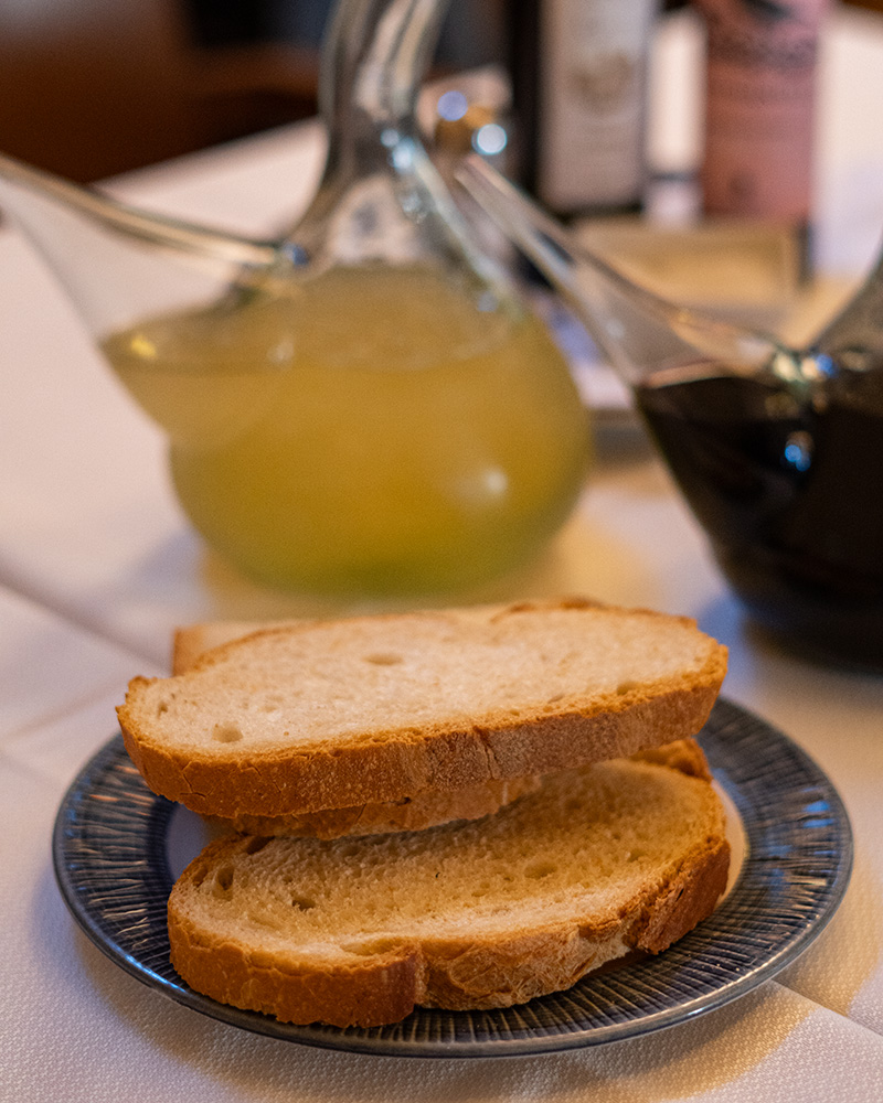 Así se presenta la mesa: un aceite de oliva virgen extra marca de la casa, un vinagre de garnacha, unas rebanadas de pan y dos porrones, uno con vino tinto y otro blanco. Tradición pura.