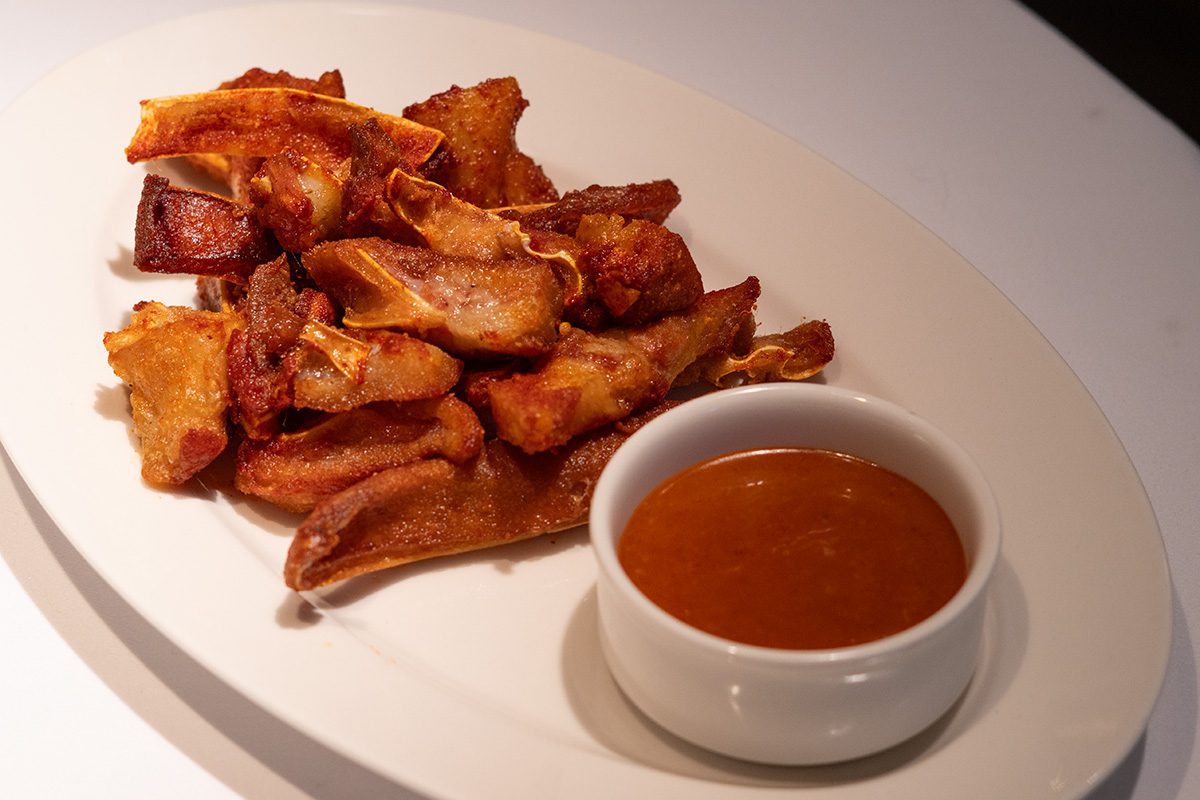 Empecé con lo que llaman “oreja frita por las bravas”. La cuecen, la fríen y la aliñan con pimentón y sal. Queda crujiente y sabrosa. El corte es grueso, así que queda o tierno o crujiente, nada de durezas.