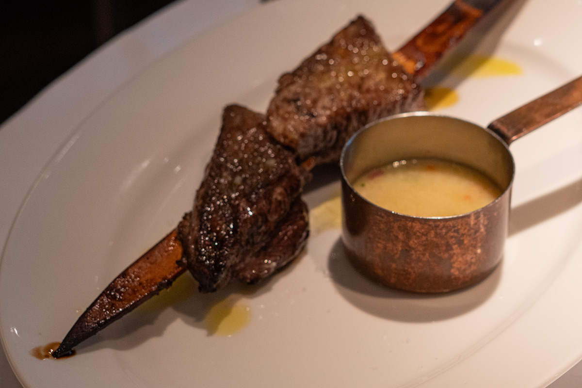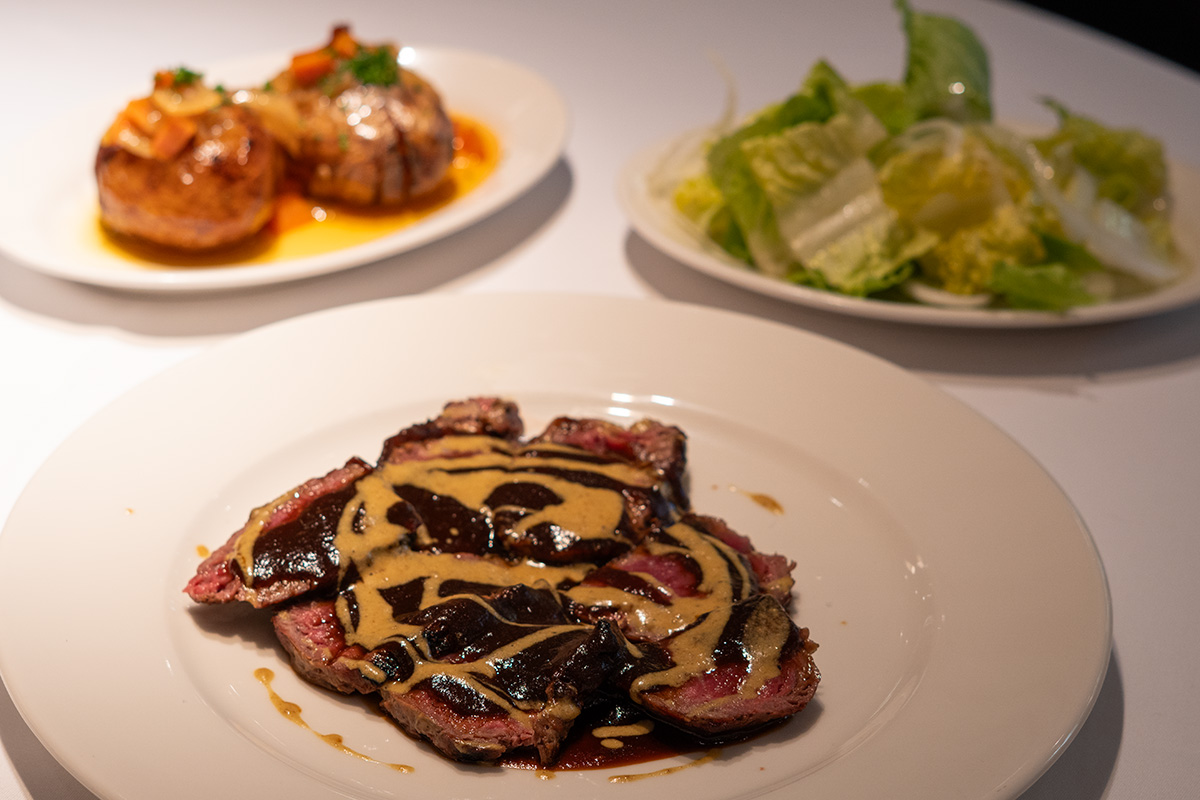 En la parte de carnes hay albóndigas de secreto ibérico, rabo de toro estofado, lomo alto y bajo de vaca frisona, magret de pato, secreto ibérico y mi elección: solomillo con salsa café de París. Marcado a la brasa, terminado al horno y servido con demi glacé, patatas con sofrito de cebolla y zanahoria y una ensalada de cogollos.