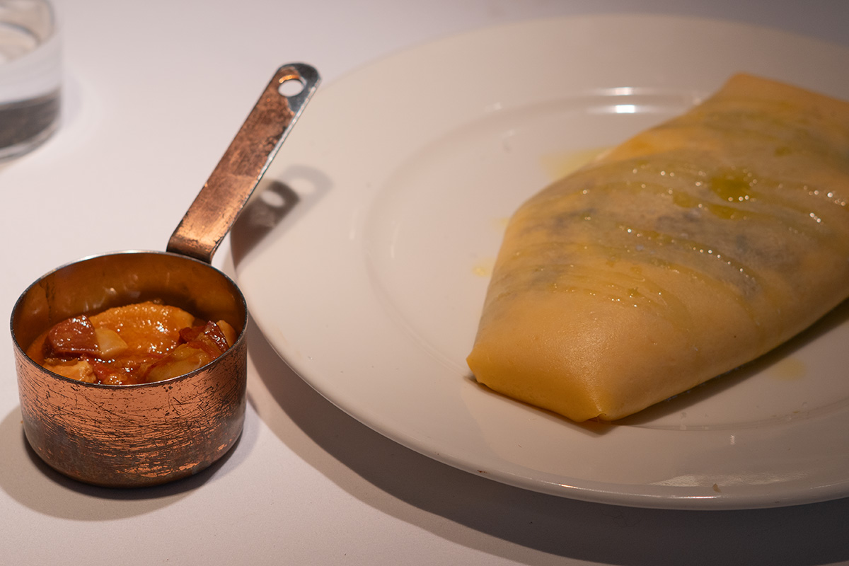 La tortilla de patata “Velazqueña” es una de las reinterpretaciones más interesantes de la casa. Patata monalisa pochada, cebolla a 140 grados, una oblea de huevo, espuma de yema… y puedes pedirla tal cual, con trufa o, como en mi caso, con callos a la madrileña.