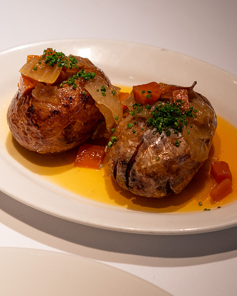 Para Las patatas de guarnición de Molino de Pez se cuecen hasta que están tiernas, después se aplastan ligeramente para que se abran un poco y se fríen en abundante aceite. Antes de servir, se pasan por el horno y se acaban con un sofrito de cebolla y zanahoria y un poco de cebollno. Tiernas y crujientes, muy buenas.