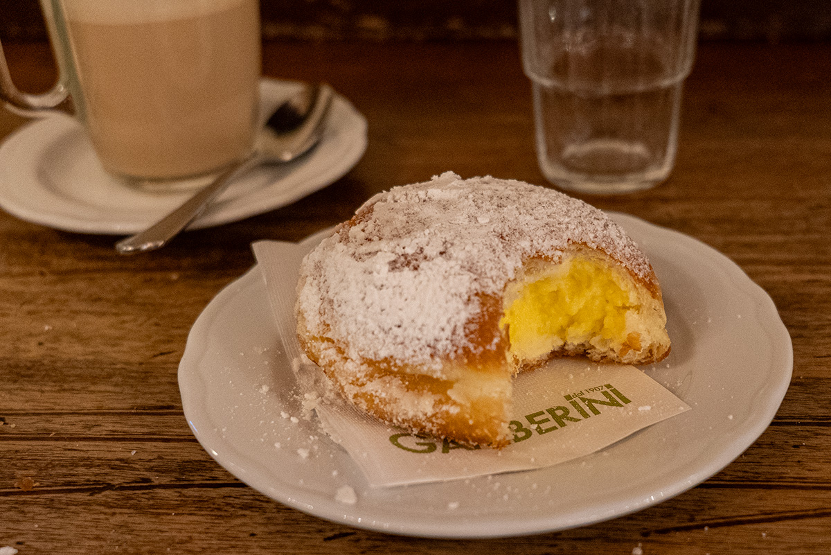 Nuestra ruta comienza a las 6:45 AM. La Pasticceria Regina di Quadri es el refugio de los locales. Aquí evitamos los estancos-cafetería para centrarnos en lo importante: el bombolone. Esta berlinesa rellena de crema es una auténtica «bomba» matutina, con una textura y sabor que marcan la diferencia frente a cualquier opción industrial.
