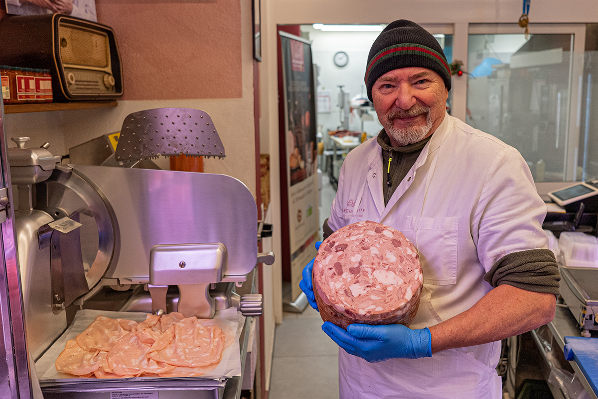 Silvio Scapin y sus hijos mantienen vivo el icono de la ciudad. Su mortadela artesanal se comercializa bajo el sello de Artigianquality, libre de nitritos y nitratos. Probamos también el salimi rosa, el antepasado de la mortadela, cortado a cuchillo para un acabado rústico y espectacular.