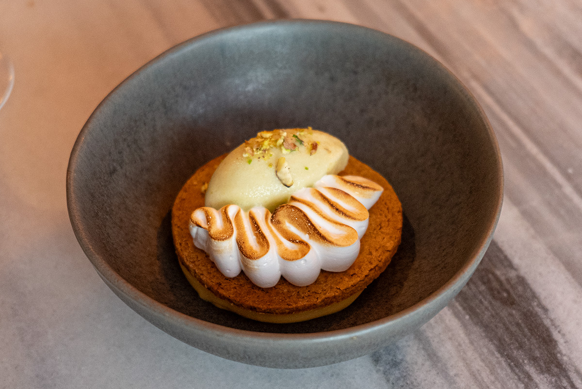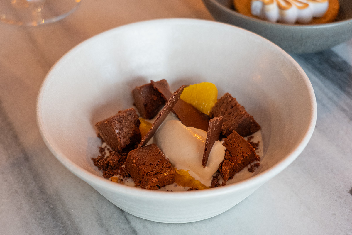 Para cerrar, dos postres que no están para salir del paso. El primero es un brownie elaborado al vapor sobre una crema de orujo, con almendra garrapiñada, crumble de cacao, naranja, helado de café de elaboración propia y chips de chocolate. El segundo parte de un curd de mandarina con gajos, sablé de pistacho, helado de lemon kosho —un fermentado de piel de limón y jalapeño—, pistacho picado y merengue tostado.