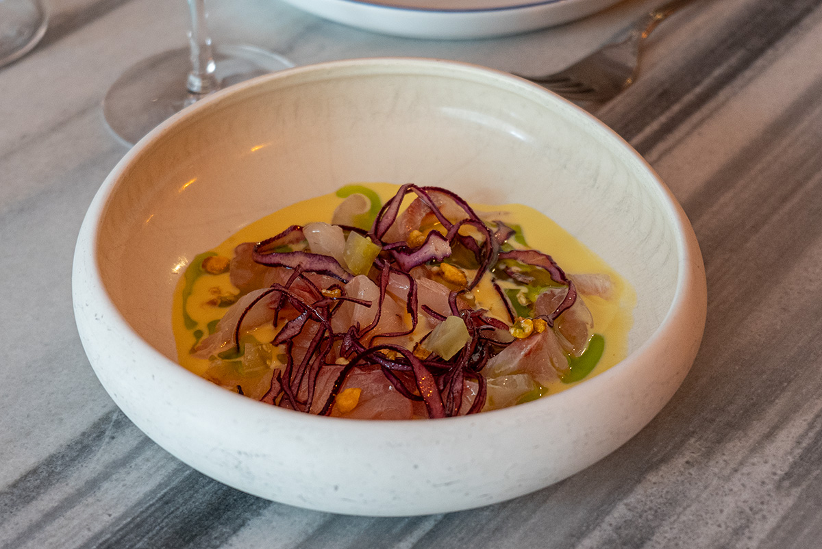El pez limón —también conocido como lecha— protagoniza un ceviche con leche de tigre de maíz en la base, el pescado loncheado, col aliñada con agua de wasabi, tomate verde encurtido, maíz tostado y aceite de jalapeño. El punto dulce, picante y ácido es muy característico, aunque el picante se mantiene suave a pesar del wasabi y el jalapeño. El pescado es delicado y el conjunto llega con una fuerza sorprendente. Hace quince años era imposible encontrar este plato; hoy es omnipresente, y Batea demuestra por qué.