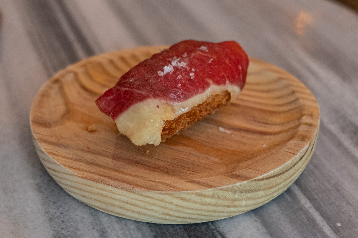La mezcla reposa en bandejas hasta el día siguiente. Entonces se pesa, se bolea y se empana: primero harina, después huevo y finalmente panko. Como van a salir el mismo día, no necesitan congelarse. Para el servicio, se fríen y se acaban con una fina loncha de picaña que se funde con ayuda del soplete. Una bechamel densa, de sabor muy marcado e intenso. Un mar y montaña tan curioso como efectivo.