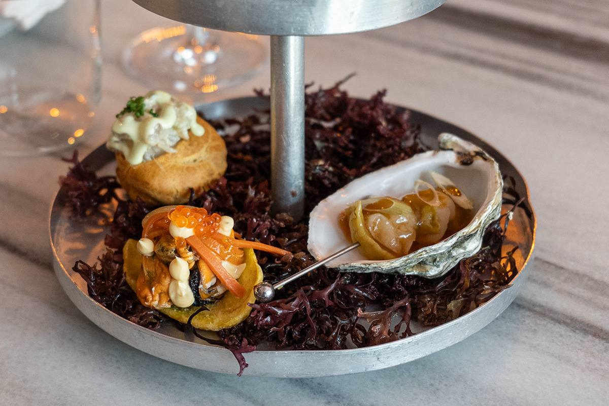Primero, una gilda con vieira curada brevemente en sal, guindilla y aceituna gordal, aliñada con una vinagreta de ponzu texturizado y un chorrito de aceite de oliva. Después, un profiterol elaborado con alga nori relleno de salpicón de gamba blanca con spicy kraut —un fermentado de elaboración propia—, cebollino picado y una emulsión del líquido del fermentado. Para cerrar, un mejillón en escabeche con verduras también escabechadas, servido sobre una patata chip y rematado con una holandesa de Jerez y huevas de trucha.