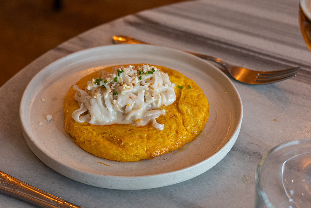 Tortilla de Betanzos con noodles de calamar y ajada gallega