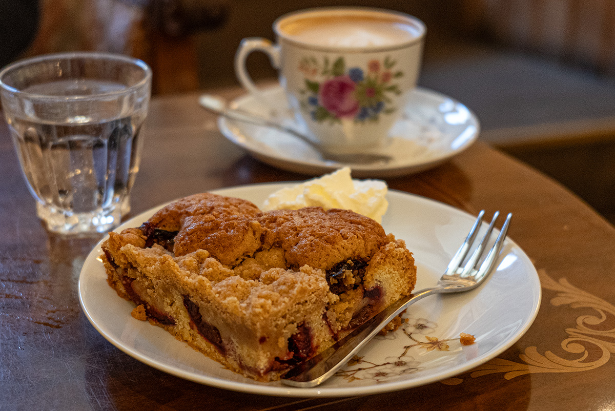 Empezamos el día en Vollpension, un lugar que va mucho más allá de una simple cafetería: es un proyecto social. Fundada por dos jóvenes que echaban de menos las tartas y pasteles de sus abuelas, tuvieron la idea de conectar a jubilados apasionados por la repostería —y con ganas de un ingreso extra— con quienes buscan algo auténtico en su desayuno. El resultado es un lugar mágico.