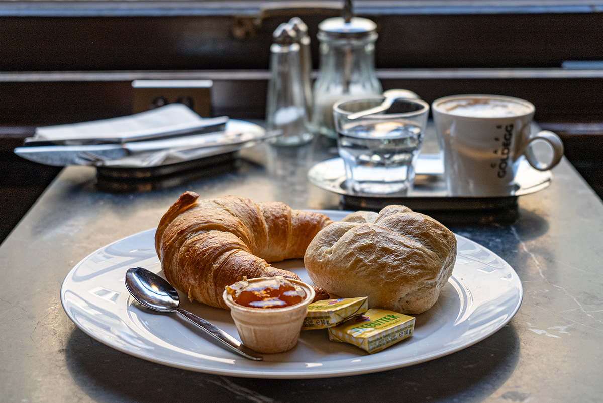 Estamos en Café Goldegg, abierto desde 1910, con esa atmósfera tan agradable de principios del siglo pasado. Me acomodé en uno de los nichos tapizados junto a las ventanas y pedí lo que llaman desayuno vienés: un bollo y un croissant acompañado de mantequilla y mermelada y, para beber, un melange, un café con leche con mucha espuma típico de la ciudad. La bollería no tiene nada que ver con la francesa, está pensada para untar, es más elástica que crujiente; con la mantequilla y la mermelada de albaricoque mejora mucho.