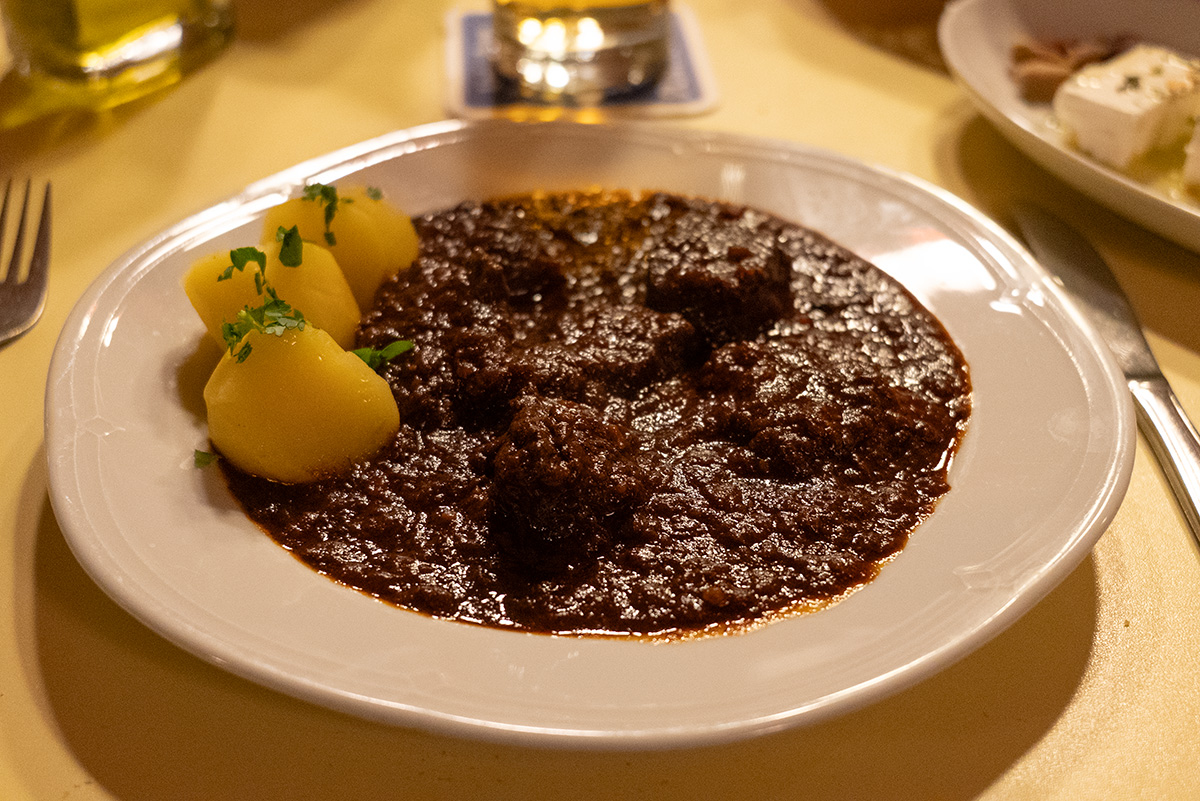 Pedí queso de oveja con aceitunas pensando que sería una ración pequeña —error, es claramente un plato para compartir— y, por fin, el goulash de ternera vienés: menos picante que el original, más denso, con más fondo, oscuro y espeso, perfecto con una cerveza fría. Lo sirven con unas patatas cocidas y pide cantidades indecentes de pan. La carne se deshace en la boca, jugosa y sabrosísima, sin ser seca ni astillosa. De todo lo que probé en el viaje, lo que más me gustó.