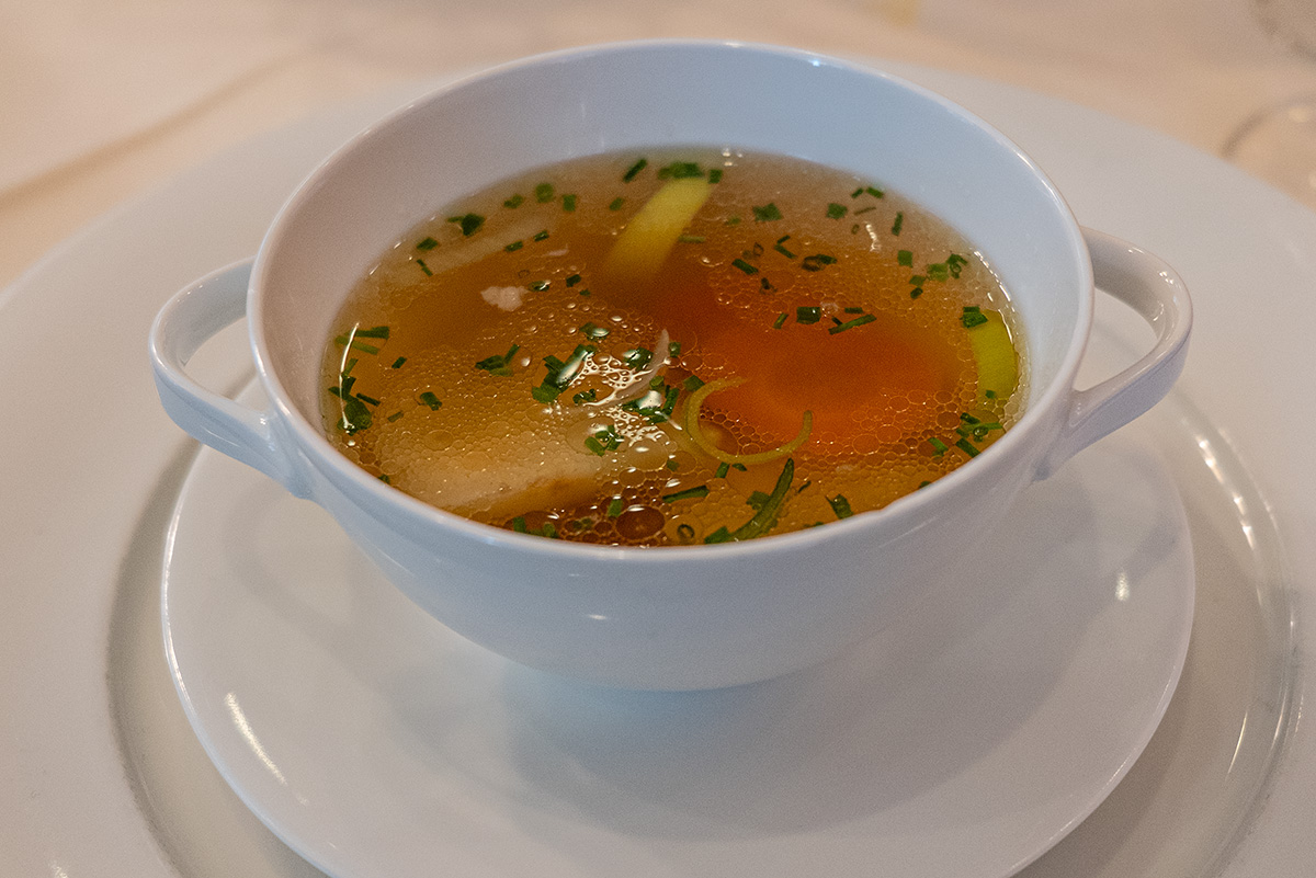 El protocolo es claro: primero disfrutas de la sopa de verduras, suave y sabrosa. Cuando acabas, rescatas el tuétano para untarlo en el pan tostado con sal y pimienta. Y, finalmente, el corte de carne. Pensé que sería insípido —cuando cueces carne todo el sabor se queda en el caldo—, pero estaba en su punto: habían hecho el caldo por un lado y, poco antes de servir, habían añadido la carne. Para darle más intensidad están las dos salsas; me gustó especialmente la de rábano picante. Hay mucho entusiasta del wasabi, que aquí suele ser un sucedáneo mediocre; en cambio, el rábano picante está a la altura y vale como diez veces menos. Las patatas de guarnición también estaban muy ricas.