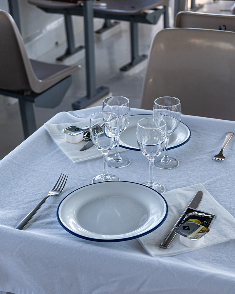 La cocina funciona en el puente superior, donde Lluís tiene montados dos fogones con unas ollas de buen tamaño. De ahí salen fideus rossejats acompañados de gamba blanca, romescos de sepia y rape, sardinadas… Cocina a bordo en estado puro, la que durante siglos han preparado los pescadores del Serrallo con lo que tenían a mano y que dio origen al romesco: ese guiso marinero de ajo, pimientos choriceros y frutos secos que es uno de los grandes platos de la gastronomía catalana.