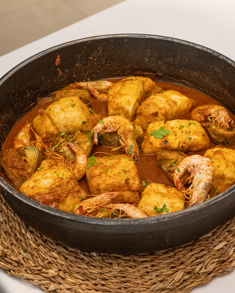 El plato estrella: El romesco de rape y lubina. Un guiso tradicional donde la salsa tiene la densidad perfecta y donde, sorprendentemente, la patata absorbe tanto sabor que compite directamente con el pescado.
