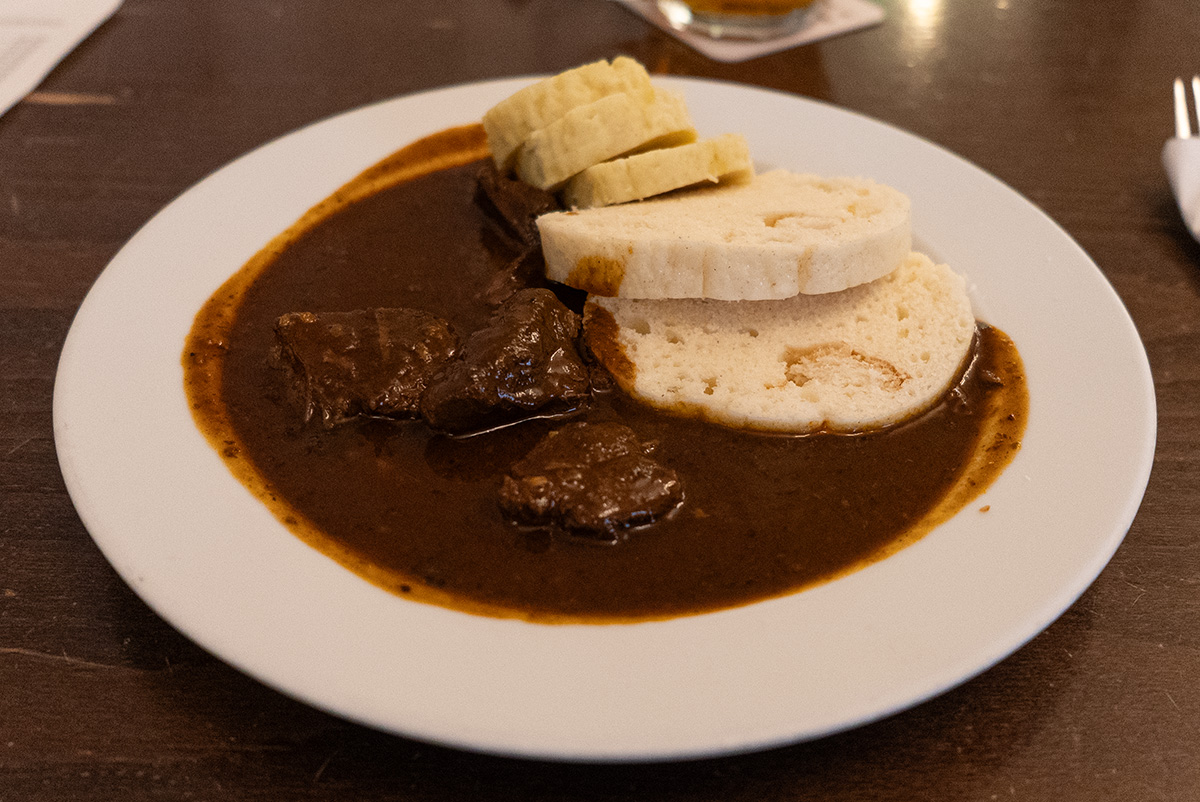 No me podía ir sin disfrutar del tradicional goulash servido con dos tipos de knedlíky: el houskový, elaborado con pan del día anterior, y el bramborový, hecho a base de patata. Elaboraciones claramente nacidas de la escasez. Los probé en varios restaurantes y no me los pude acabar; impregnados en la salsa están ricos, pero están pensados para saciar.