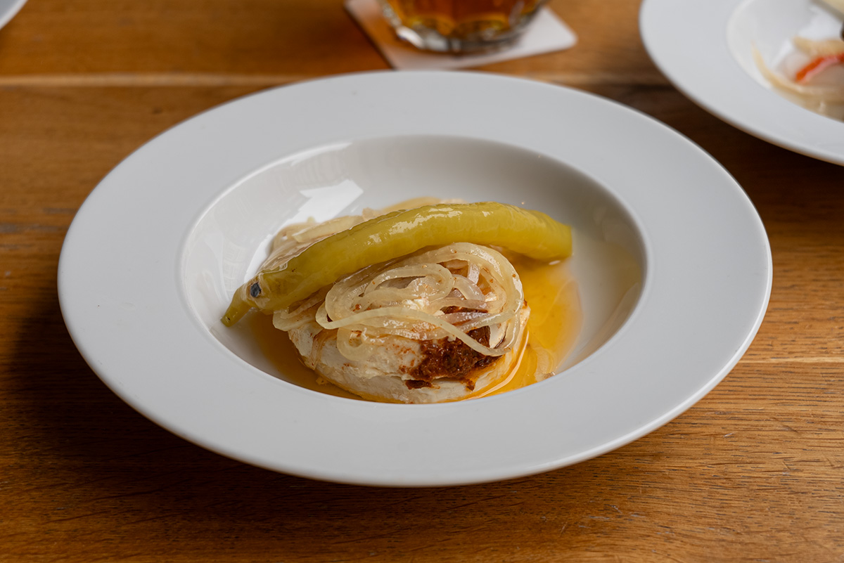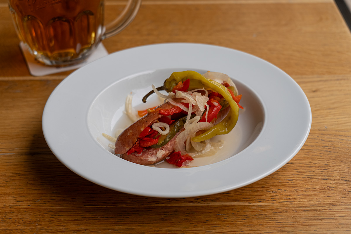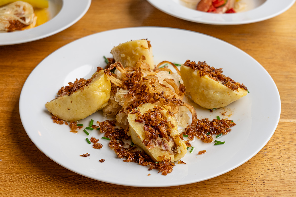Repetí de clásicos: nakládaný hermelín —queso marinado en especias con cebolla y guindillas— y utopenci, salchicha macerada en vinagre. Las raciones son enormes, mejor para compartir. También probé el queso frito con salsa tártara, una «guarrada» gastronómica que hay que probar, y los knedlíky de patata rellenos de carne ahumada con chucrut y cebolla frita.