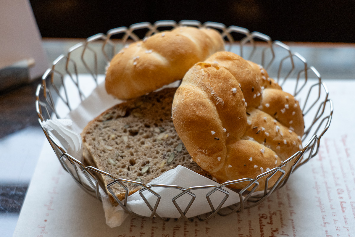 Como esperaba lo que esperaba, me conformé con un pan con mantequilla y llegó una cesta enorme con tres tipos de pan diferentes. El rohlík con sal y comino es muy peculiar, elástico, un punto crujiente y muy aromático.