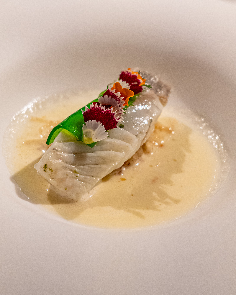 En el plato, una salsa de berro de agua infusionada con mano de Buddha, cítrico de perfume intenso y delicado a la vez, que aporta una dimensión aromática difícil de olvidar. Las algas del propio curado se reconvierten en guarnición, cerrando el círculo del proceso.