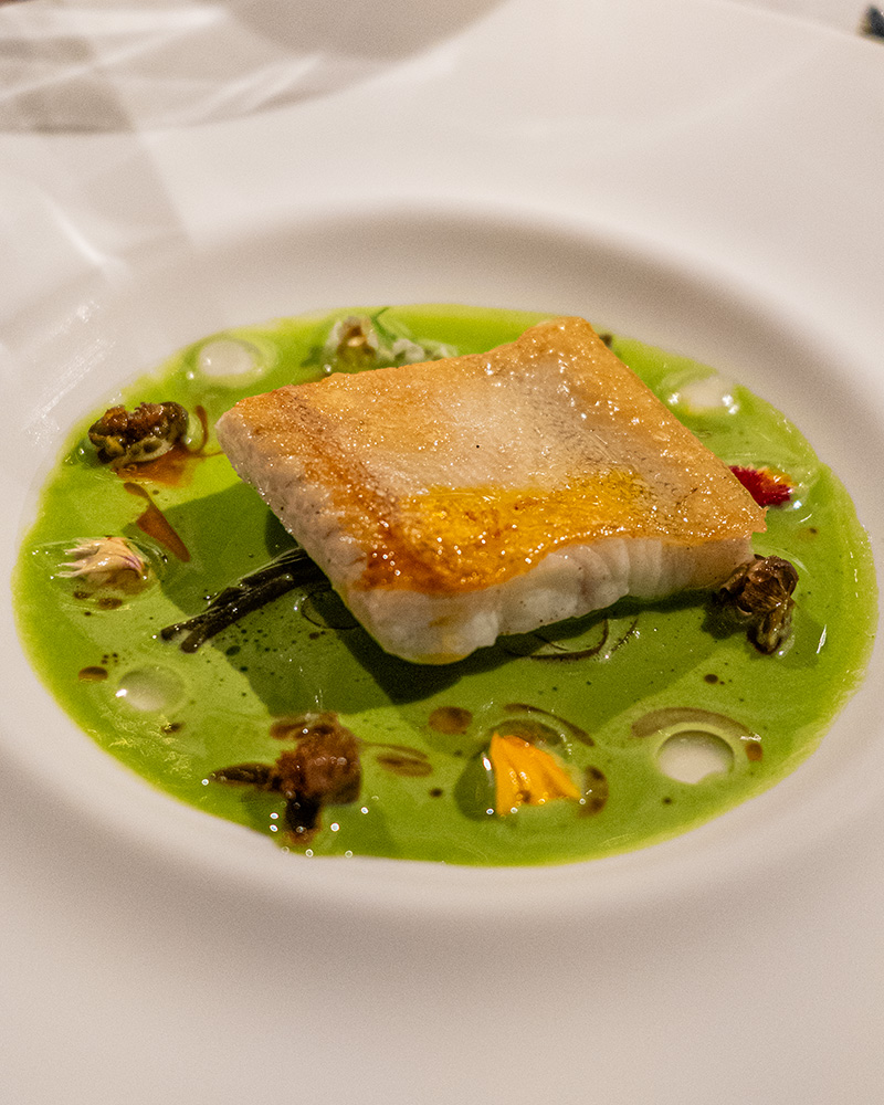 La cocción es igual de cuidadosa: se cocina sobre una sal de algas con la piel hacia abajo, que después se retira, y se termina a la plancha para lograr ese punto preciso que lo hace memorable.