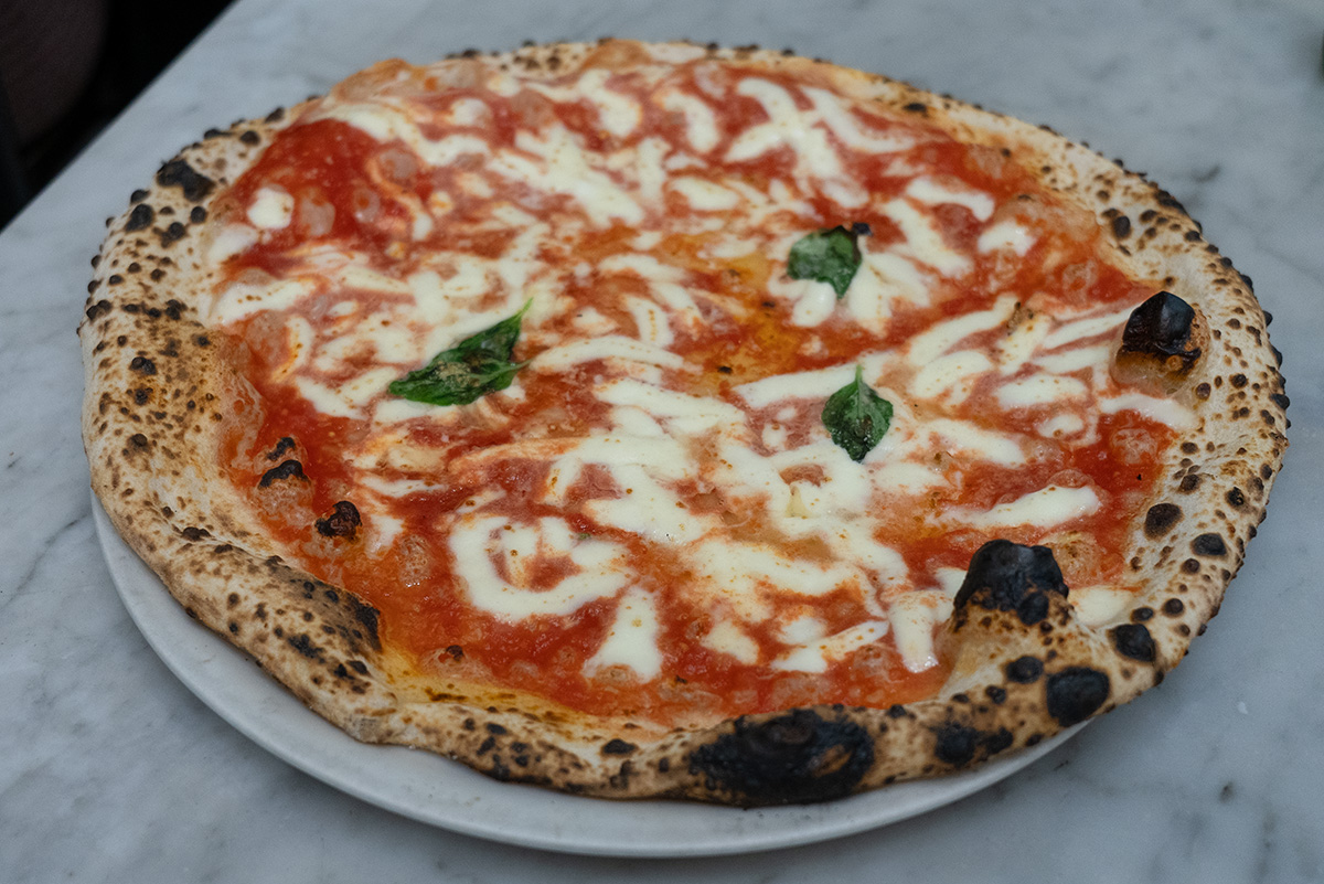 ¿Cómo es la pizza napolitana? Ante todo, es un estilo, puede gustarte más o menos. Parte de una masa de harina, agua, sal y levadura, un primera fermentación en bloque a temperatura ambiente y una segunda ya boleada. La margherita clásica lleva tomate en conserva, crudo pero pasteurizado, mozzarella y albahaca fresca, a veces con un toque de parmesano y suele llevar un chorrito de aceite. Se cuece en horno de leña a casi 500 grados durante 60‑90 segundos y sale grande, muy fina, blanda y elástica, casi chiclosa, con la masa moteada y algunas zonas casi quemadas. No se sostiene bien con las manos y se come mejor doblada o con cubiertos. A mí me encanta, aunque la primera vez que fui a Nápoles me sorprendió.